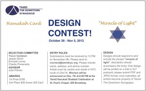 Designs should respond to and include the phrase “miracle of light”; description should accompany the entry; final design will be printed on a 4×6 or 5×7 postcard; please submit PDF and JPEG format; once submitted, all entries become property of Tamid: The Downtown Synagogue.