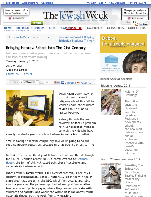 Bringing Hebrew School into the 21st Century, January 8, 2013, The Jewish Week: When Rabbi Darren Levine started a once-a-week religious school this fall, he worried about the students having enough time to master Hebrew.Midway through the year, however, he faces a problem he never expected . . .Read the Article