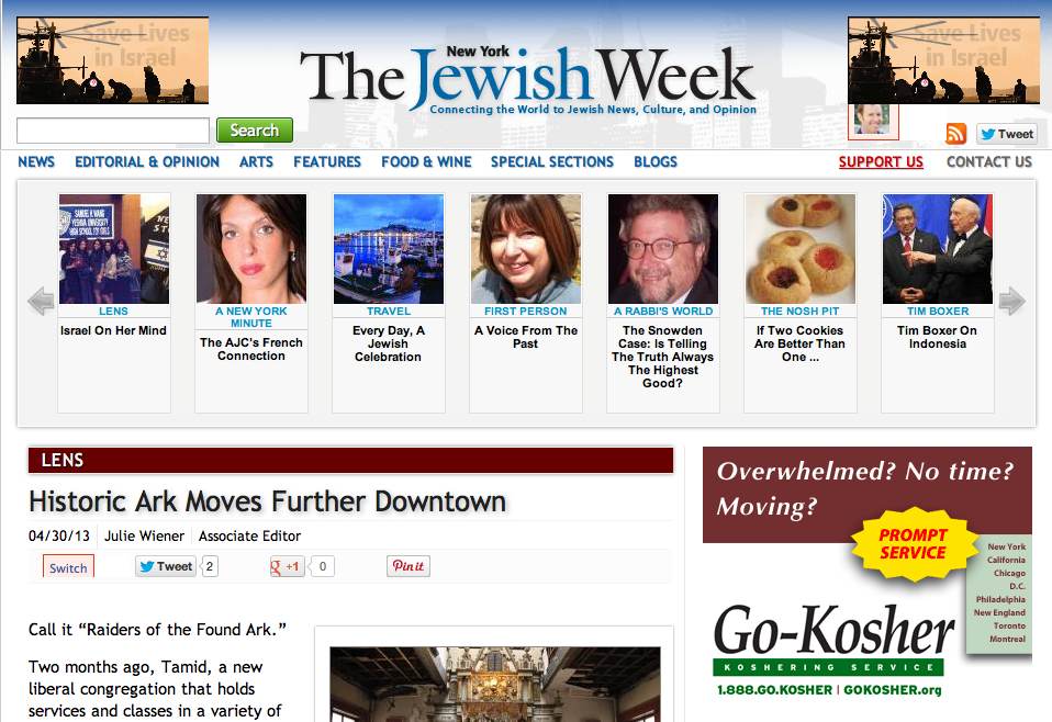 Historic Ark Moves Further Downtown, April 30, 2013, The Jewish Week: “Call it “Raiders of the Found Ark.” Two months ago, Tamid, a new liberal congregation that holds services and classes in a variety of downtown locations, began raising money to build an ark to hold its Torah scroll. A week and a half ago . . .Read the Article
