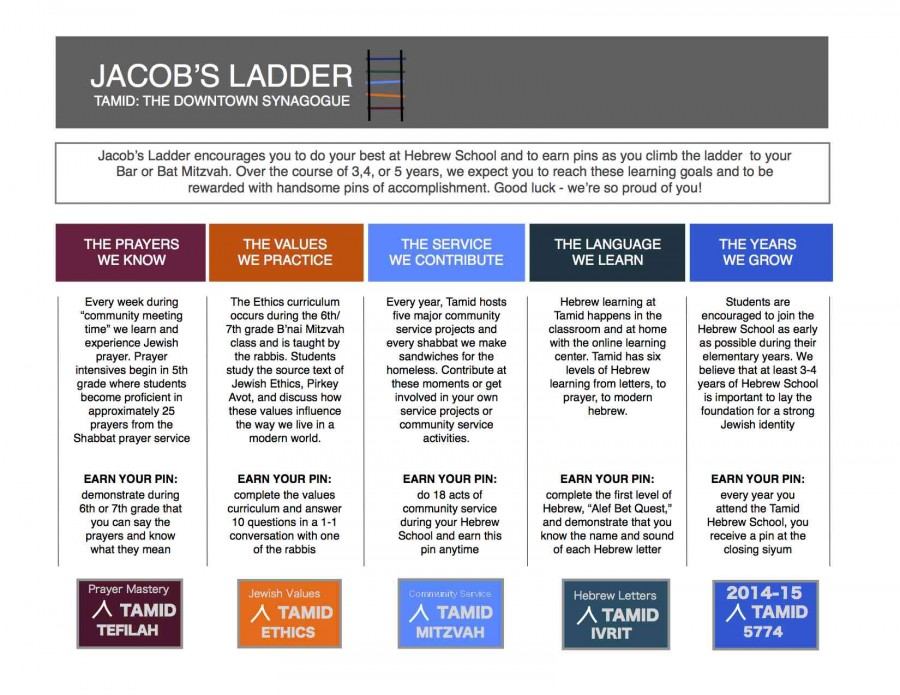 Out students earn pins in prayer, hebrew letters, community service, and Jewish ethics. Read more on the diagram and if you have any questions, contact our office. Thanks for reading about Jacob’s Ladder!