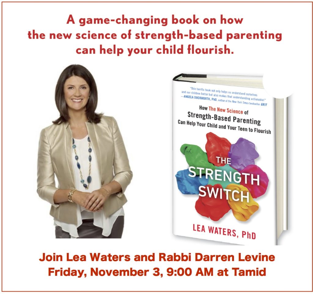 Author Lea Waters, PhD, will join us for coffee on Friday morning, November 3rd, 9 – 10:15 AM. Dr. Waters is an expert in Positive Parenting and her latest book, “The Strength Switch,” shows us how strengths-based parenting can help our children and teens thrive and flourish.