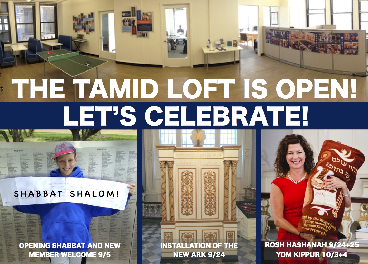 + Tamid LOFT is Open! August 19, 2014 | dimatdimat | Blog, Community Our NEW Space is OPEN so LET’S CELEBRATE! Drop by Sept. 5 between 5:30 and 7:00 PM for a Shabbat nosh and a chance to welcome new Tamid members and families! We look forward to seeing you soon!